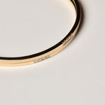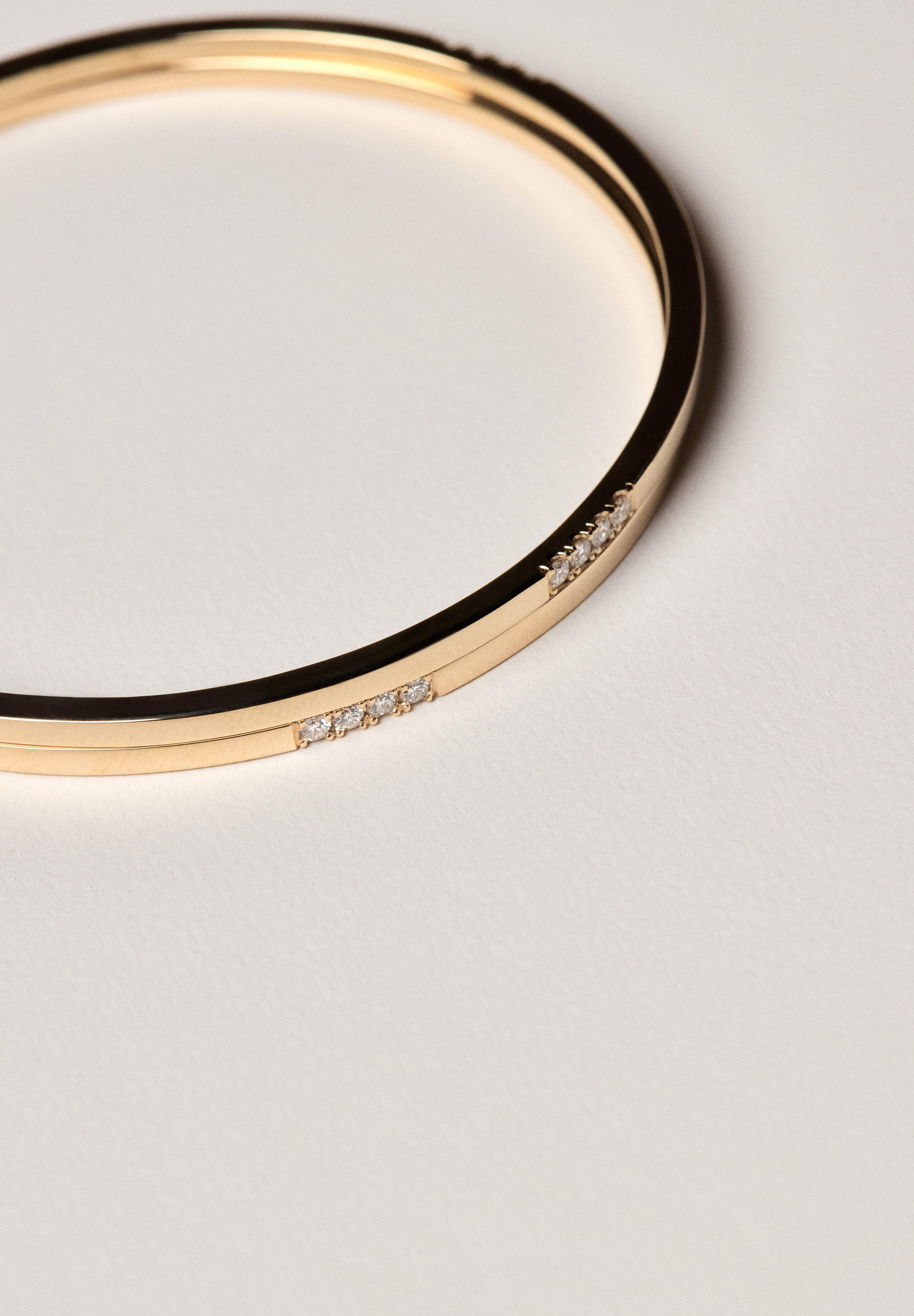 The Quadrant Bangle is a refined piece crafted from 9ct Yellow Gold. The design features 16 round lab-grown diamonds (0.03 carats each) with a total TDW of 0.48 points and F VS clarity. With a bangle width of 2.4mm and depth of 2.6mm, it offers a sleek, comfortable fit.