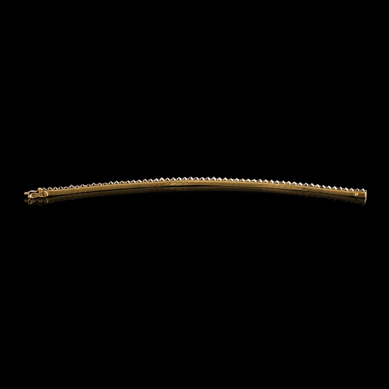 The Inverted Black Diamond Bracelet is crafted from 18K Yellow Gold. The design features 13.3ct of Inverted Black Diamonds with a Box and Tongue Catch, with 2 figure-8 safety catches. The bracelet is 18cm long and is a bold design that will capture attention.