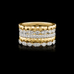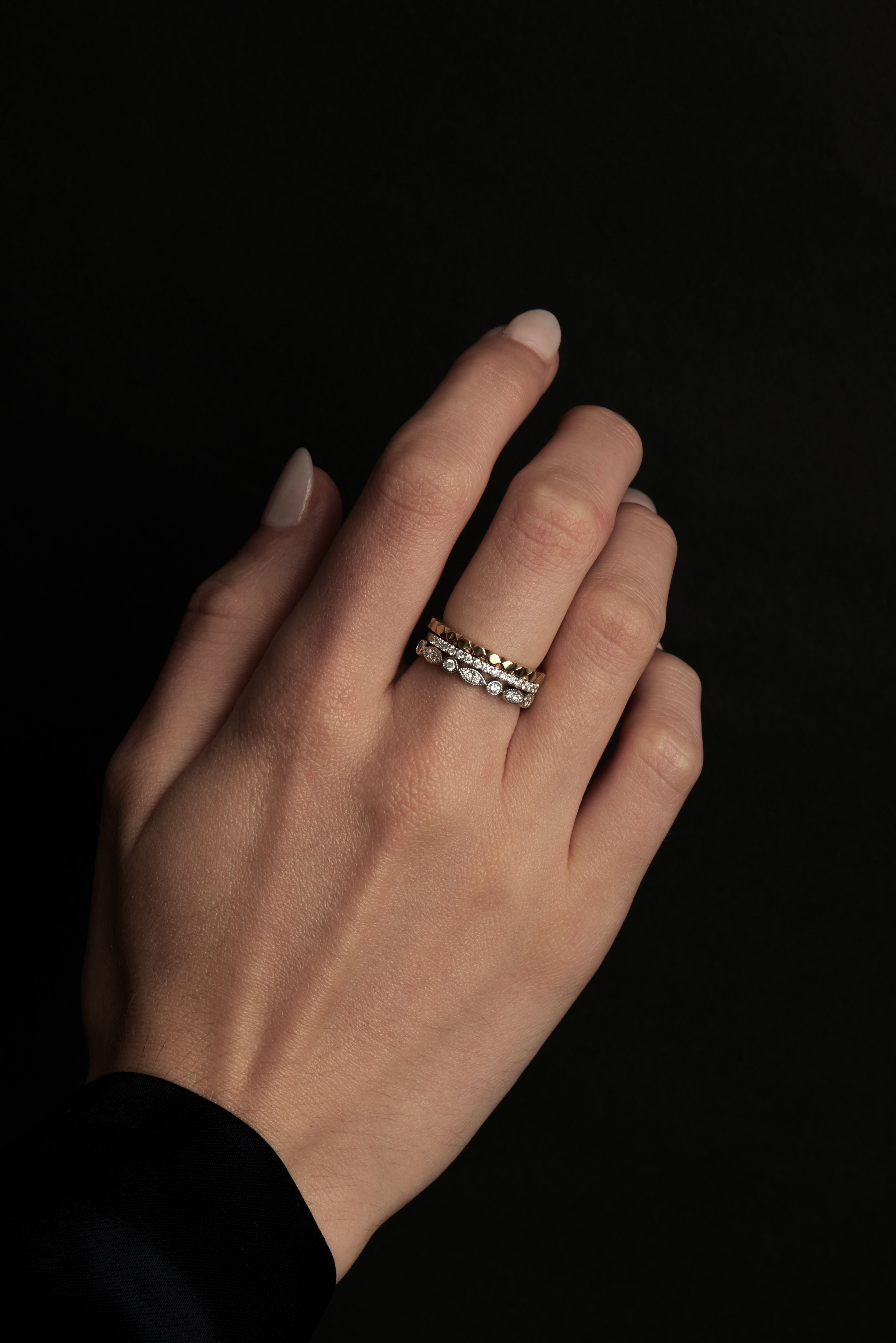 The Titan Stack Ring is created with three rings. The design features a patterned geometric wedding band in either 9K or 18K Gold (White or Yellow), a plain micro set band featuring 20 x 1.5mm GSI Diamonds in White Gold, and a Marquise and Round shaped full eternity band, featuring 24 x 1.5mm GSI Diamonds.