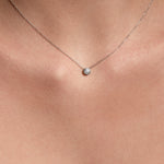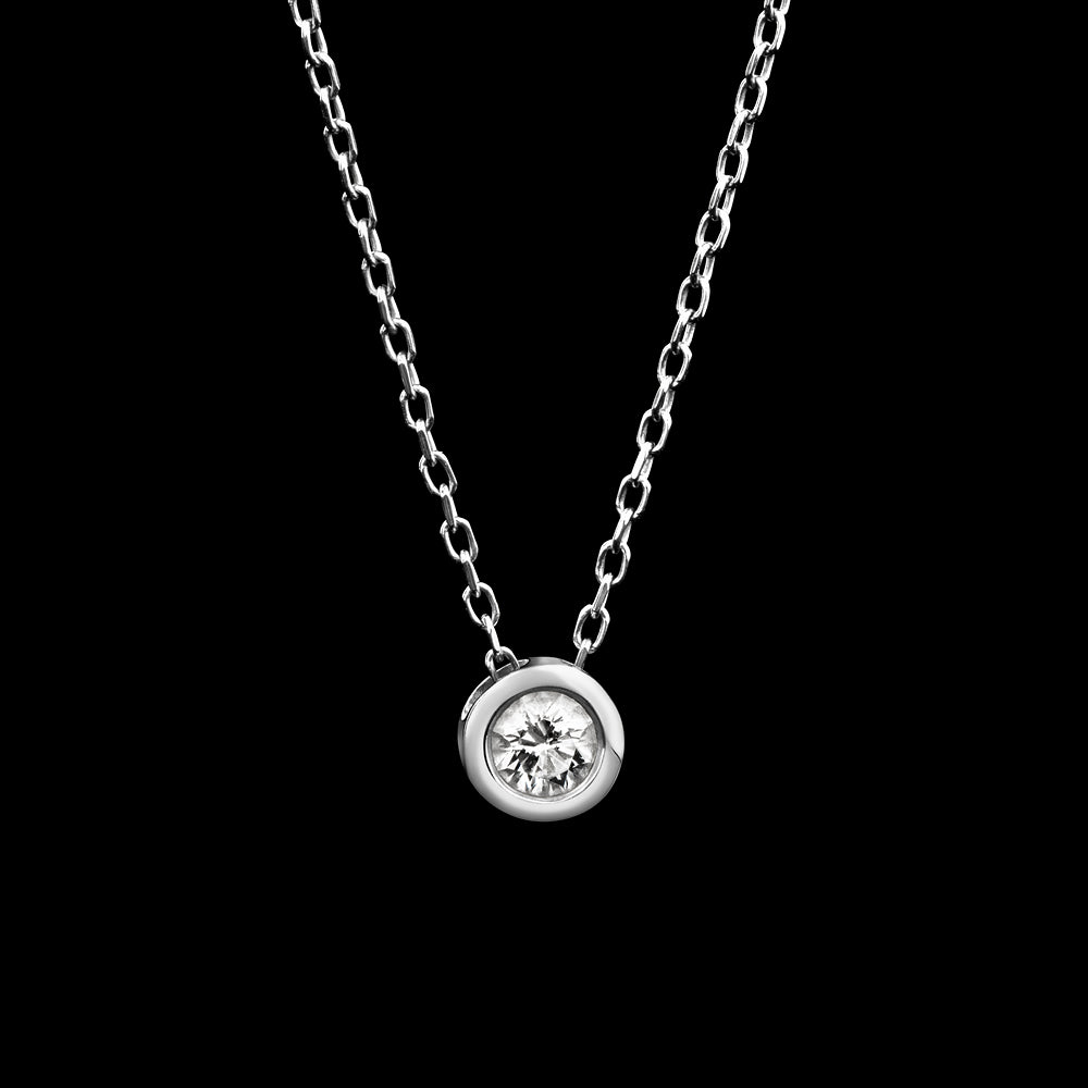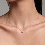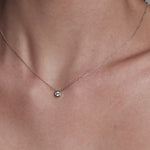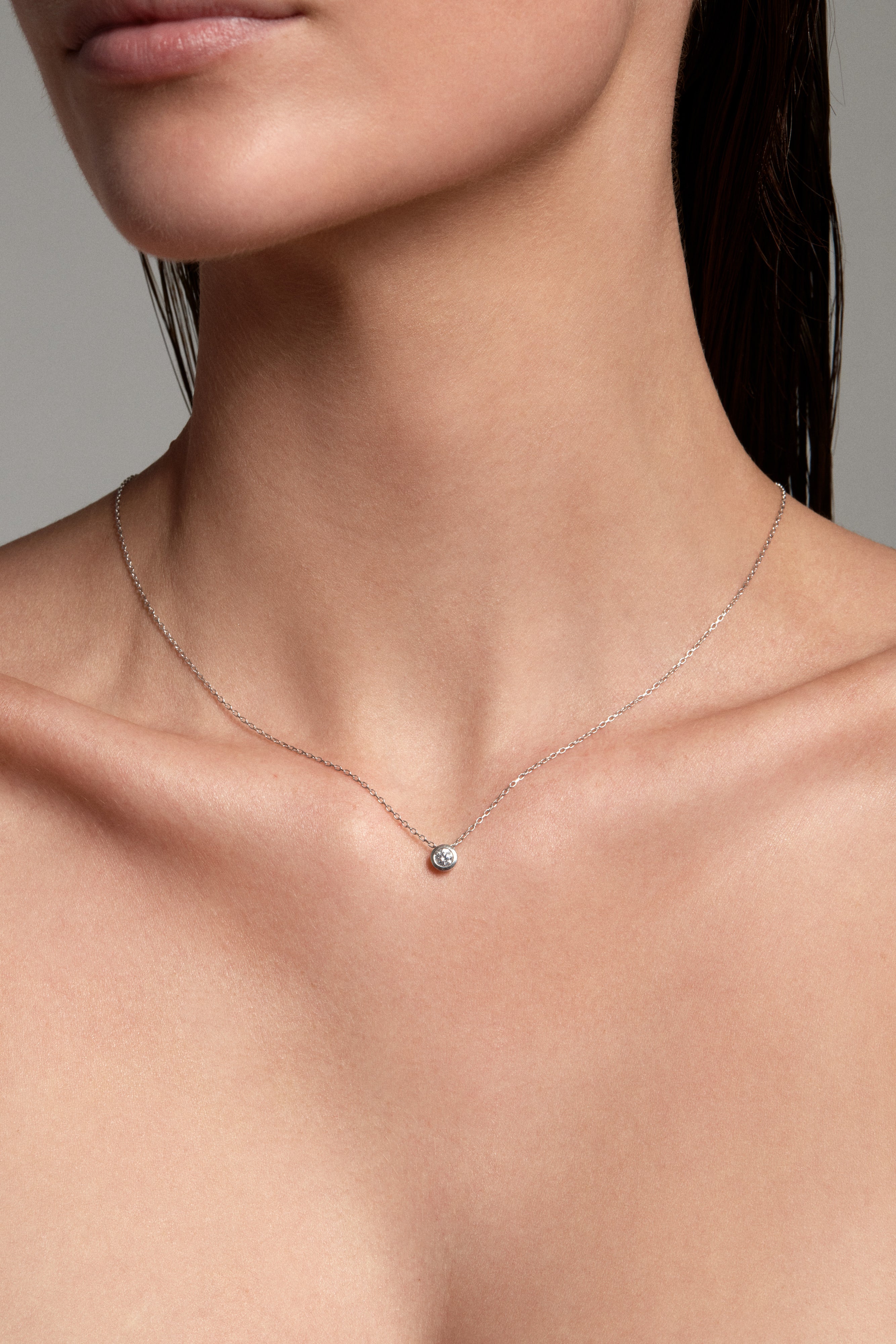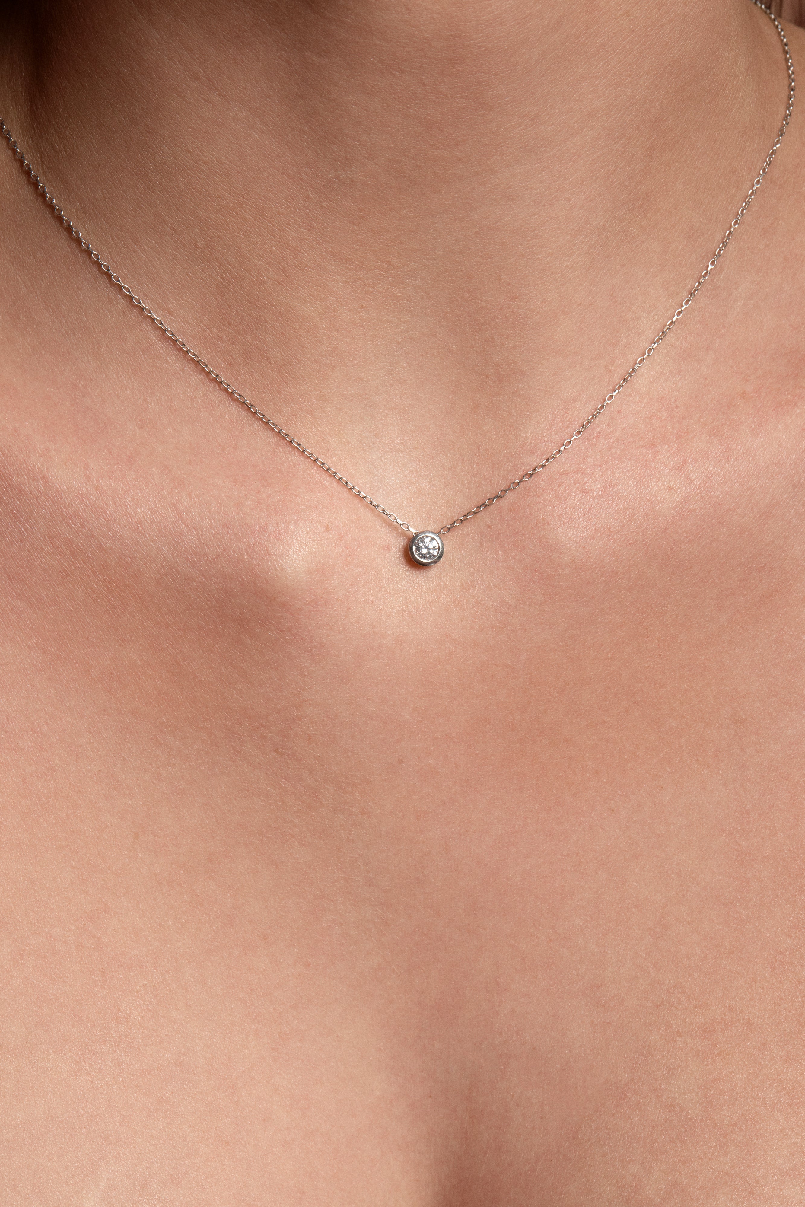 The Mini Diamond Necklace is crafted from 18K White Gold. The design features a single bezel-set round brilliant 0.15pt diamond, which shines at the centre of this delicate and refined white gold necklace.