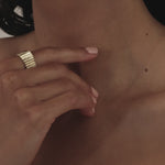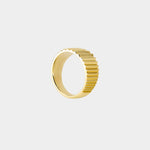 The Gaura Step Ring is crafted with 9K Gold (Yellow or Rose). The design features a dimensional striped band ring with 15mm wide step cuts. The ring beautifully reflects light, making a stunning statement piece.
