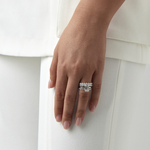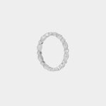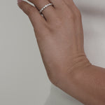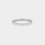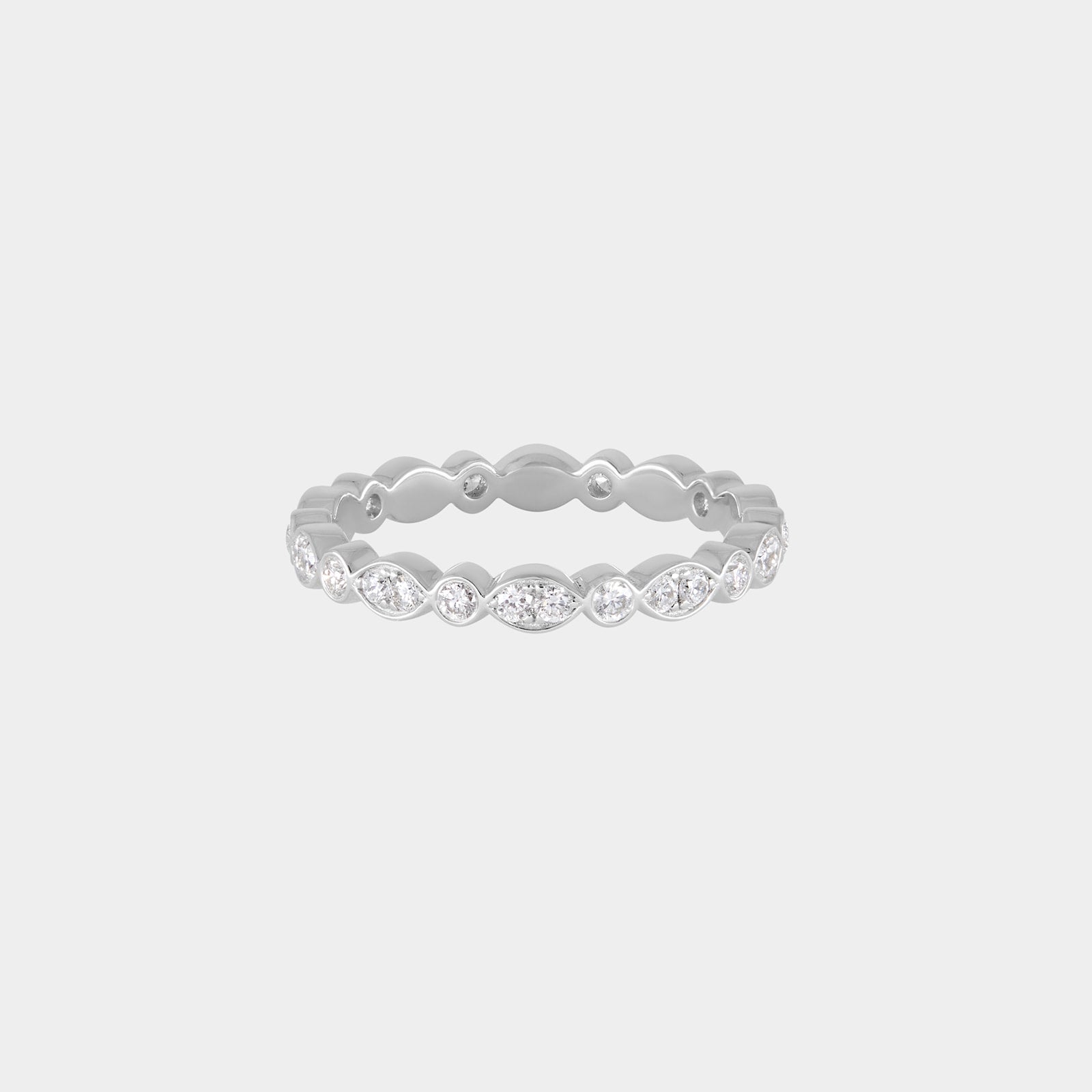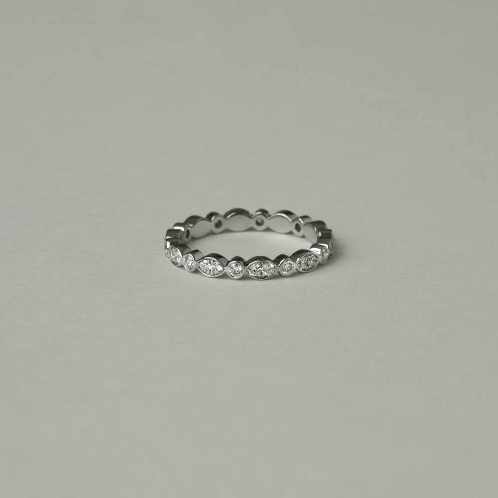 Discover the Zoey Full Band, a modern wedding ring crafted in 18ct white gold by Brownhaus. Featuring an alternating bezel-set round diamond band with a double diamond bed-set marquise shape, this ring exudes contemporary sophistication. With an approximate total diamond weight of .50 carats and an FSI grade, the Zoey Full Band is the essence of modern love.