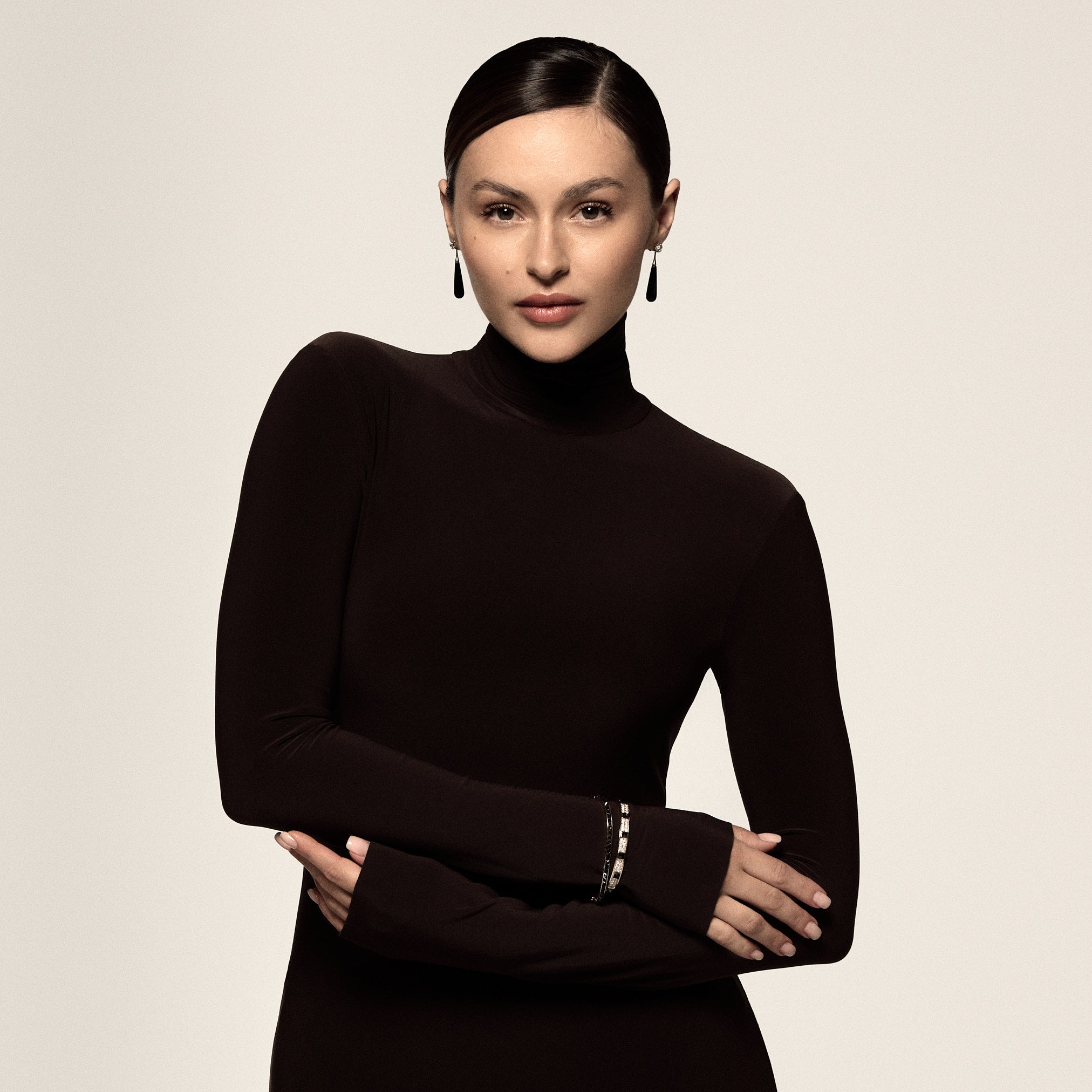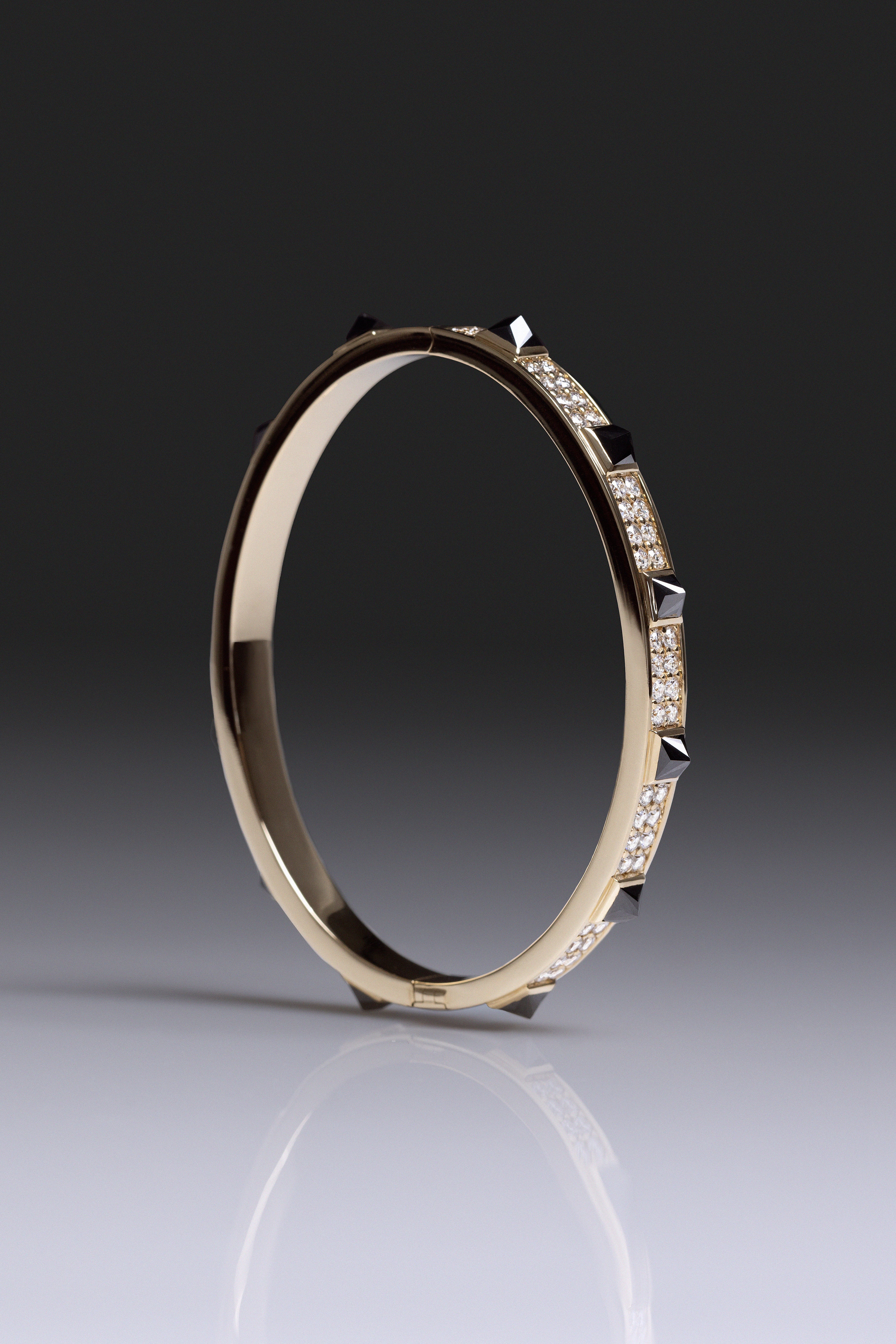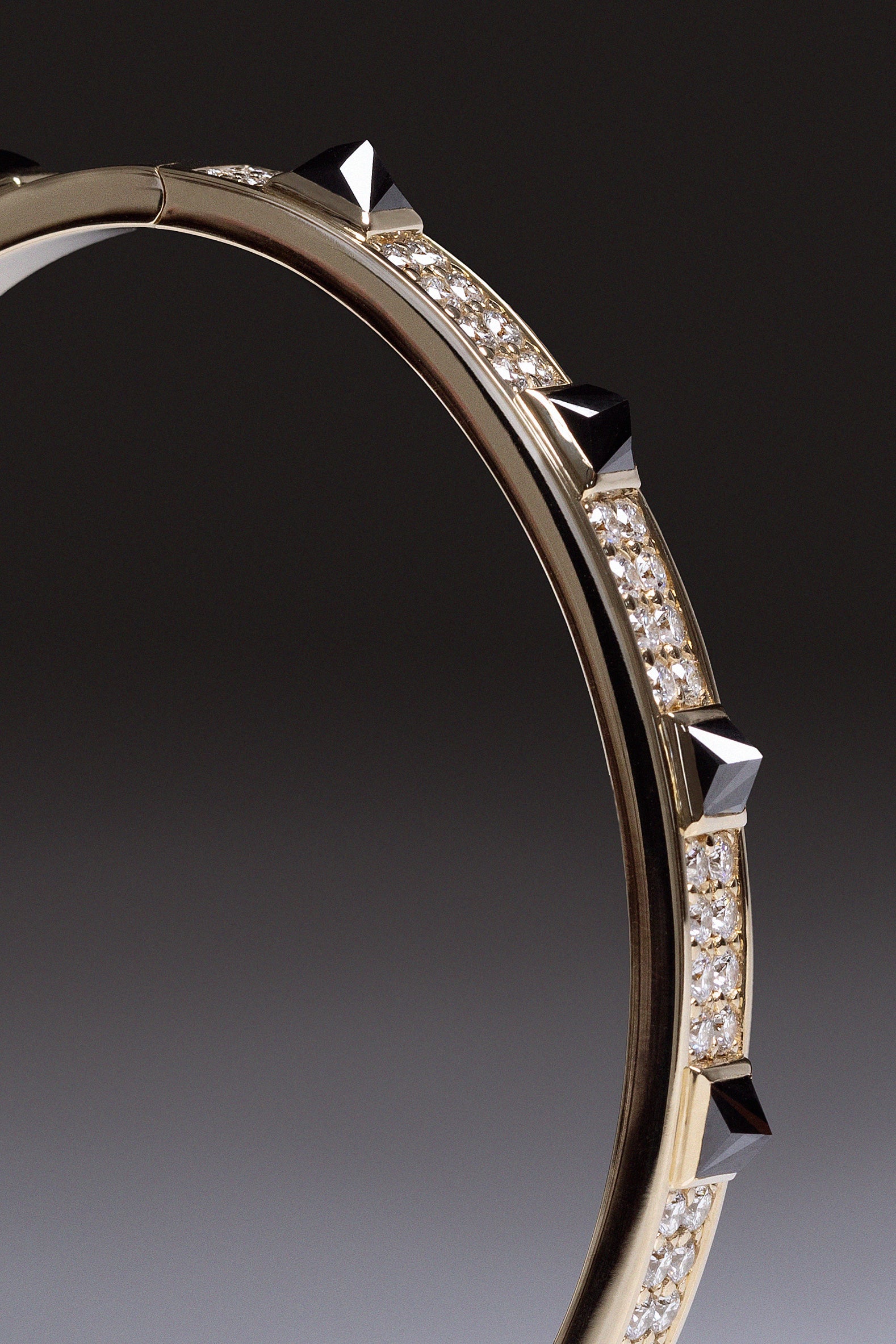 The Apex is punctuated by 104 round F VS natural diamonds totalling 3.99ct, set within the smooth expanse of the gold. Weighing 0.038pts each, these diamonds create a brilliant contrast against the deep, jet-black of the 12 inverted black princess cut diamonds. With a total carat weight of 8.23ct the bold black diamonds are set precisely and evenly, elevating the entire piece into a study of opposites—light and dark, strength and grace.