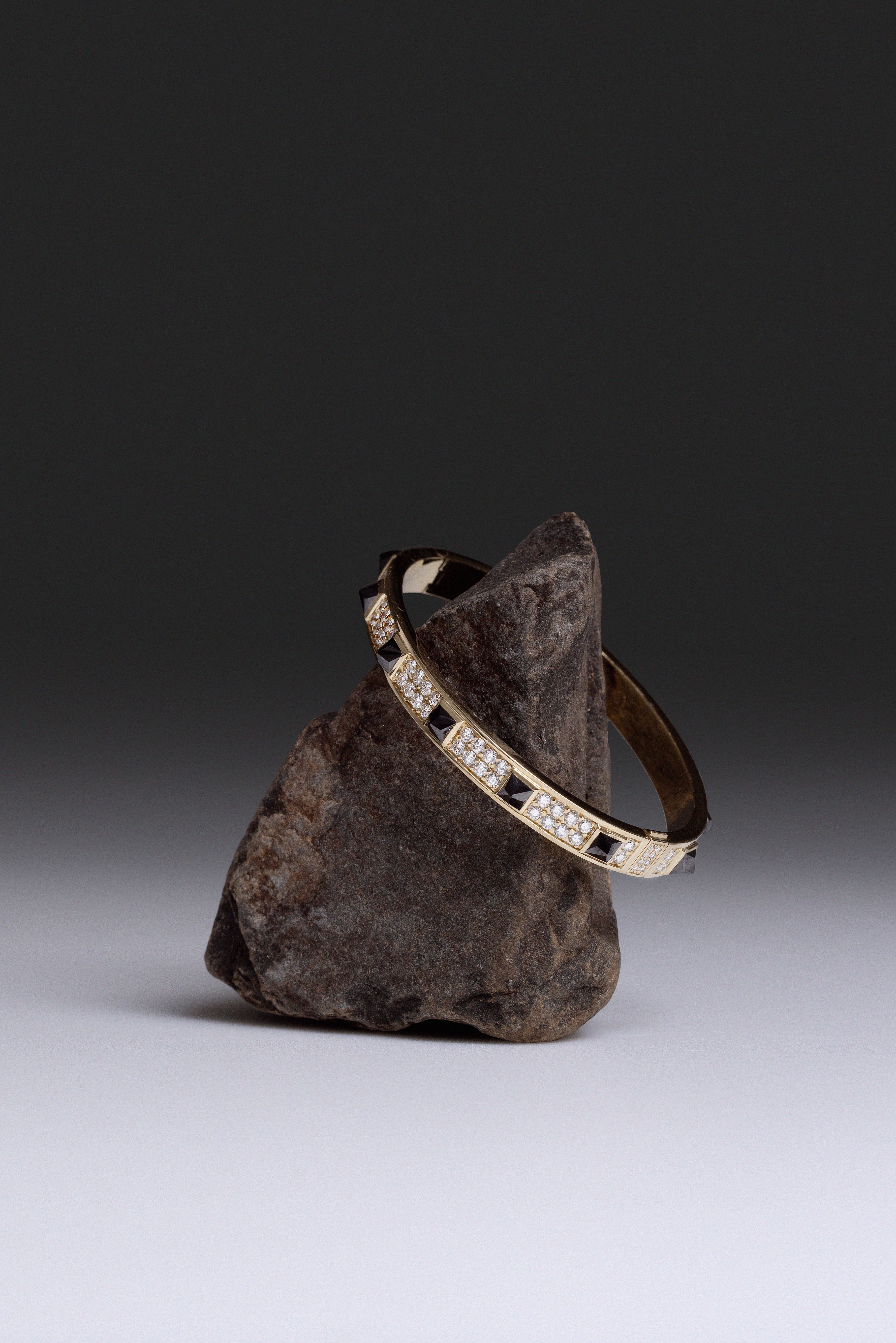 A bold testament to refined strength and modern sophistication, the Apex bangle commands attention with its sleek, angular lines and striking contrast of textures. Crafted from 18ct Yellow Gold, and designed to comfortably encircle the wrist, the hinged oval bangle fastens securely with a diamond set invisible European clasp.