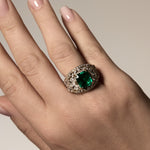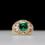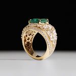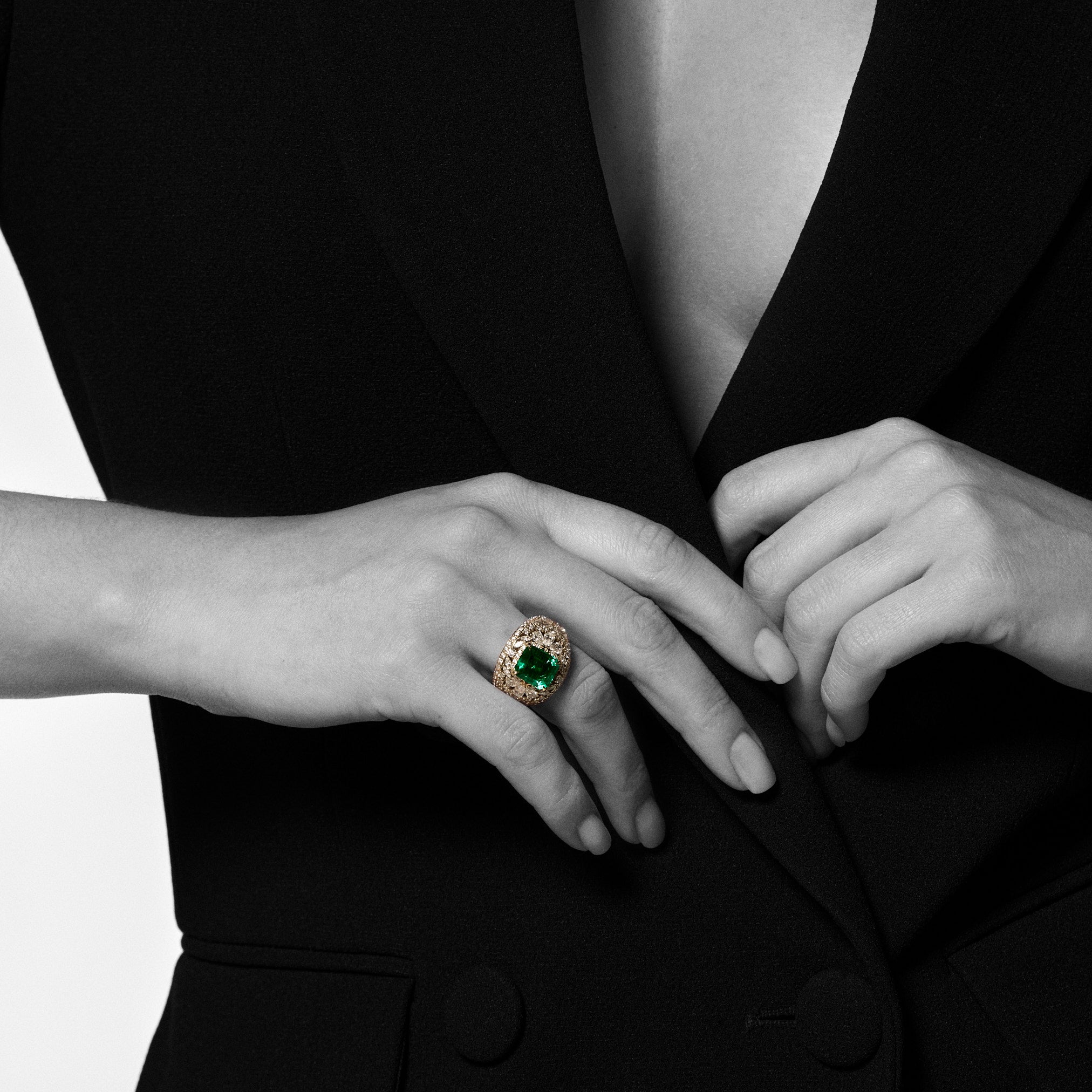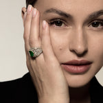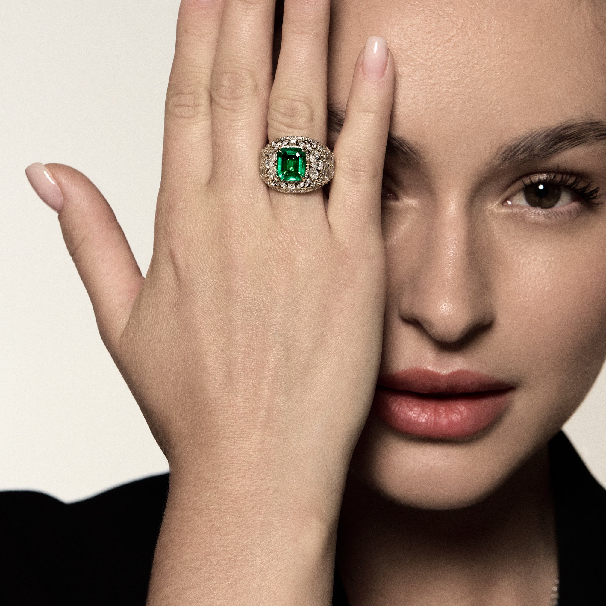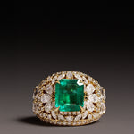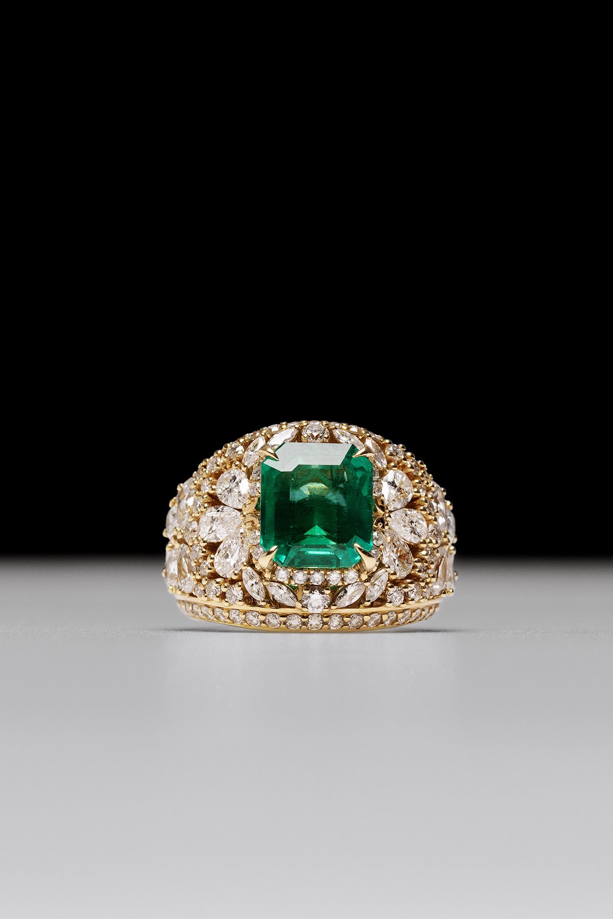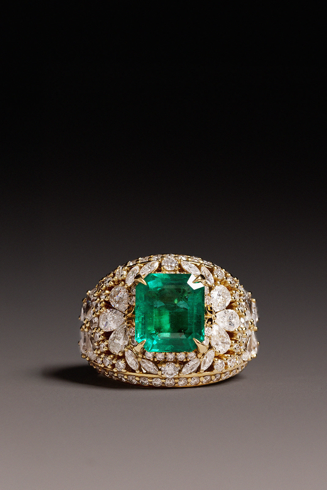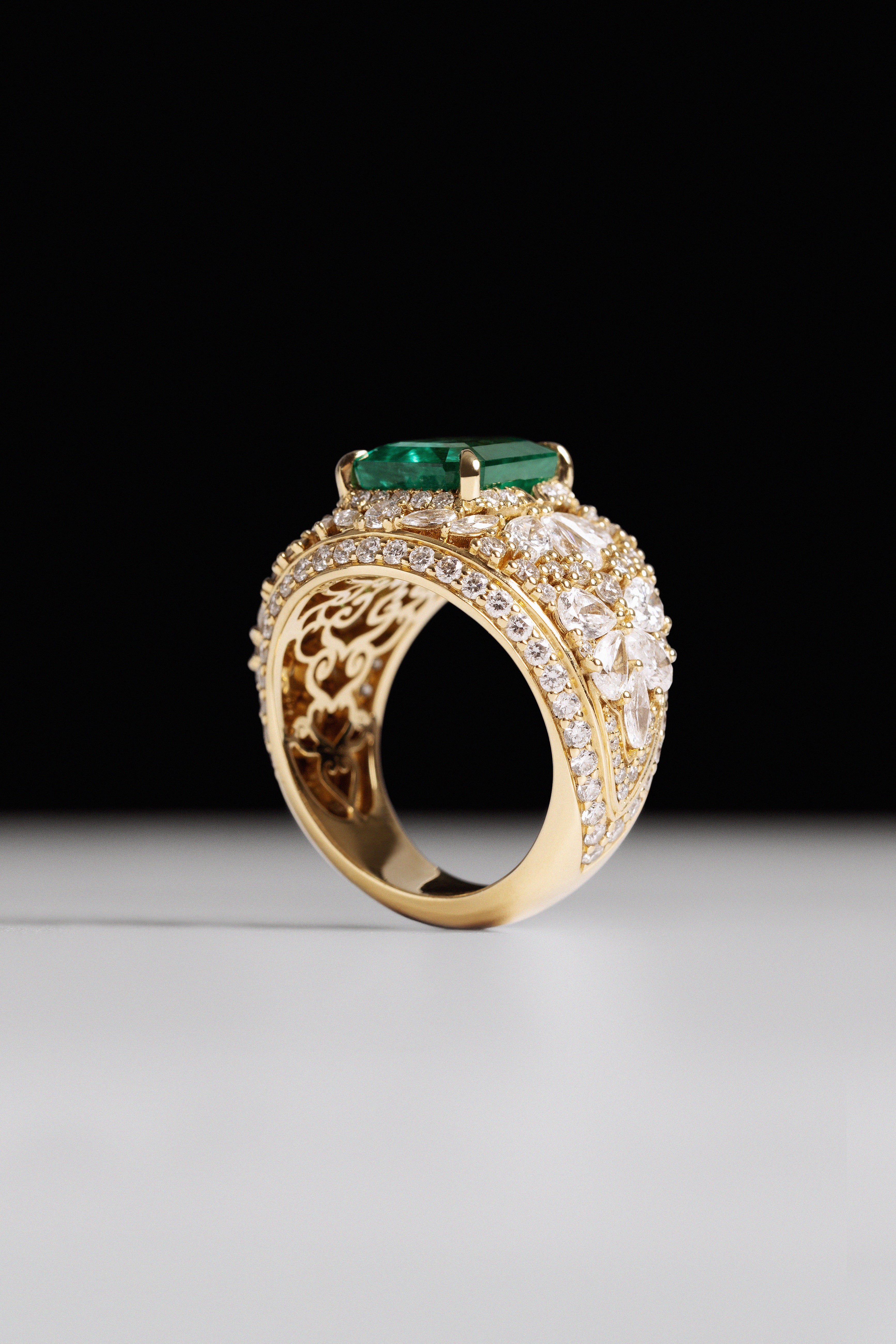 At its heart lies a breathtaking emerald-cut Emerald, weighing 4.15ct, glowing with a rich verdant hue. This precious gem, measuring 10.30mm by 9.01mm, and 5.72mm in depth, is surrounded by stunning constellation of 148 natural diamonds. These diamonds—meticulously selected marquise, pear-shaped, and round cuts of F VS clarity—encircle the emerald, creating a symphony of light offering a total diamond weight of 4.21cts.