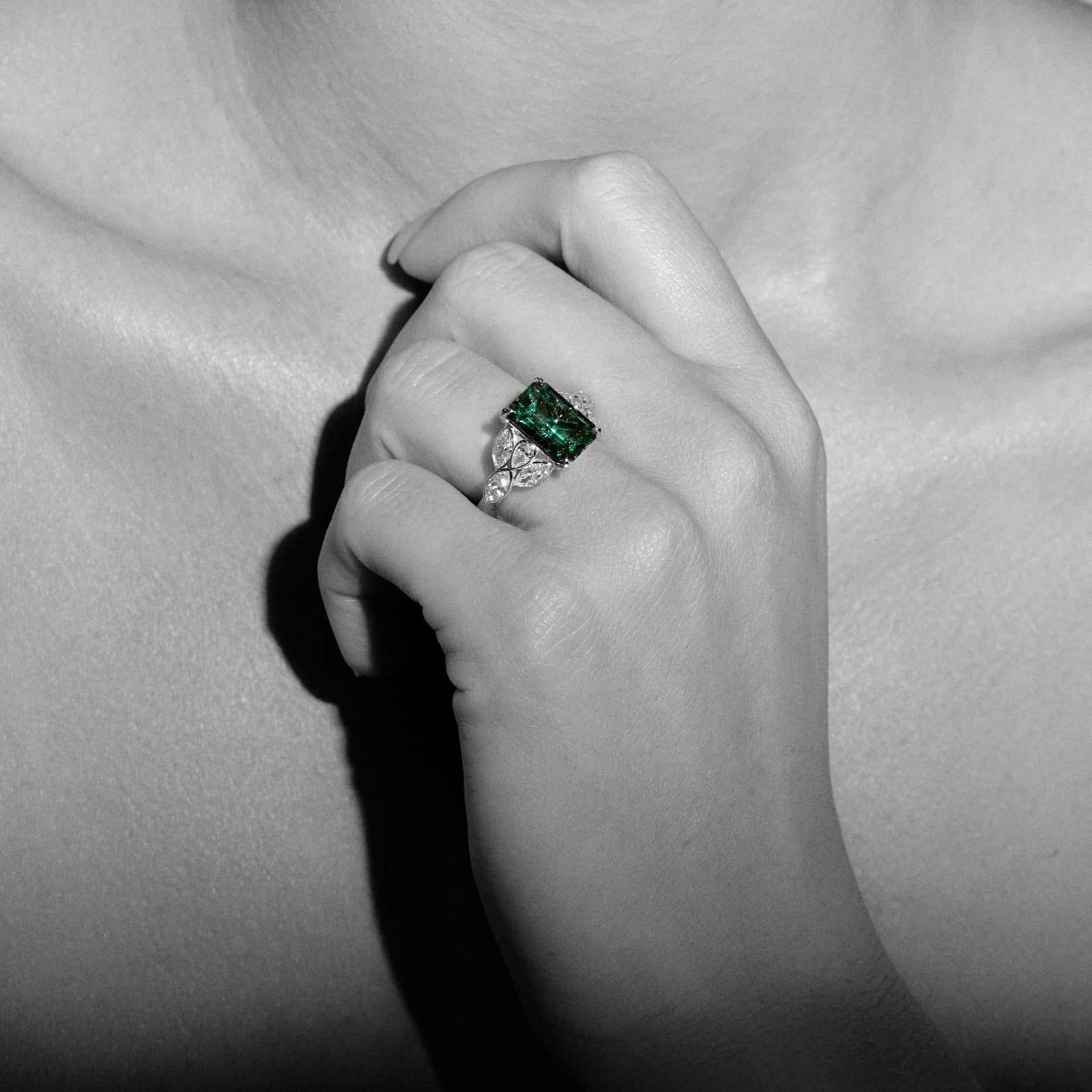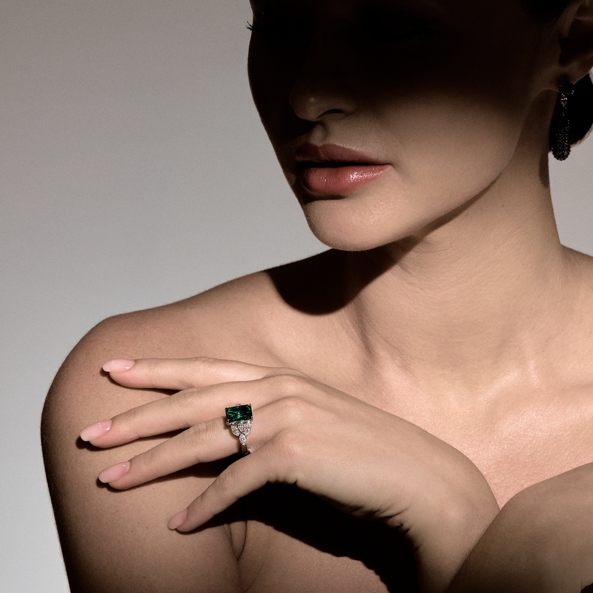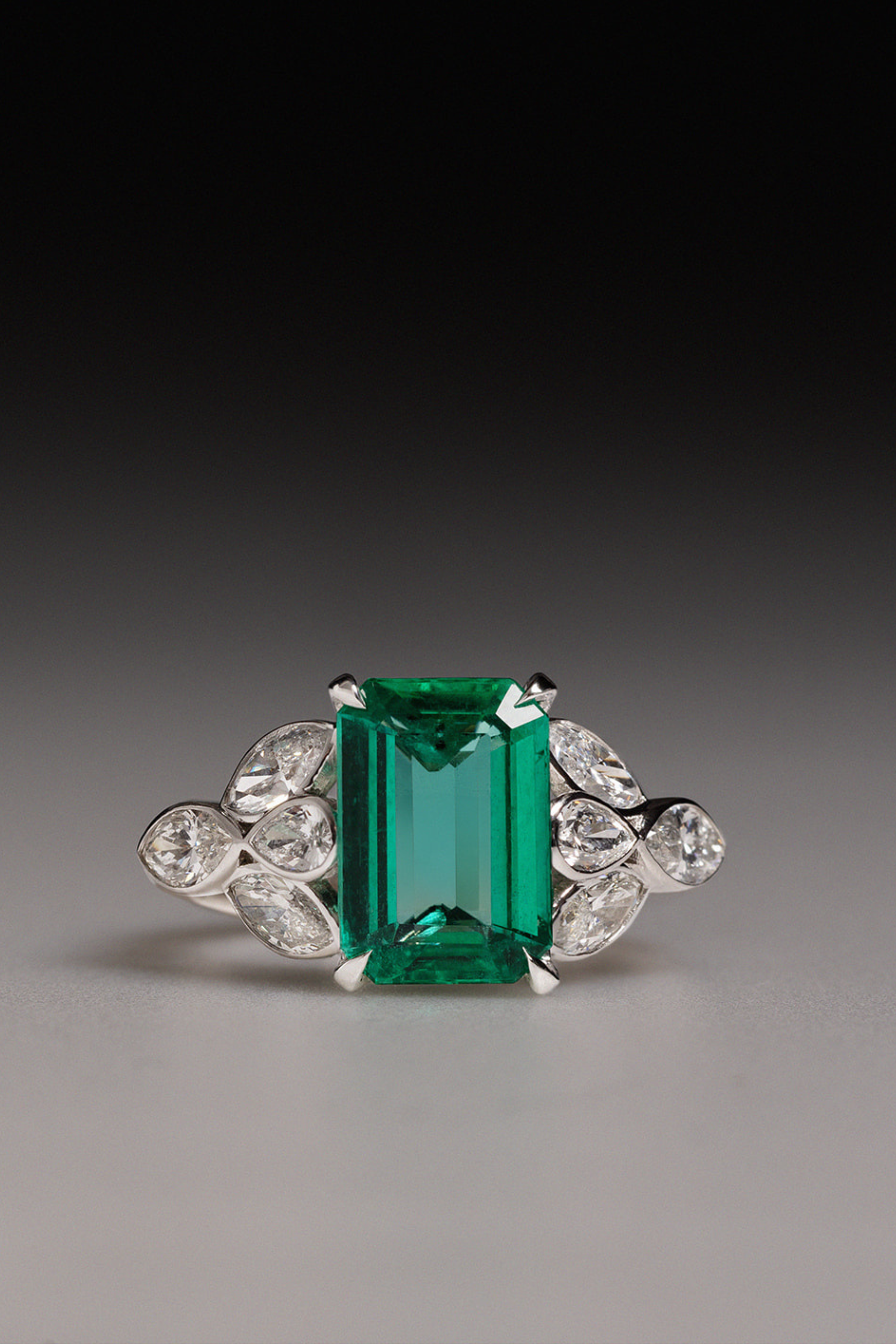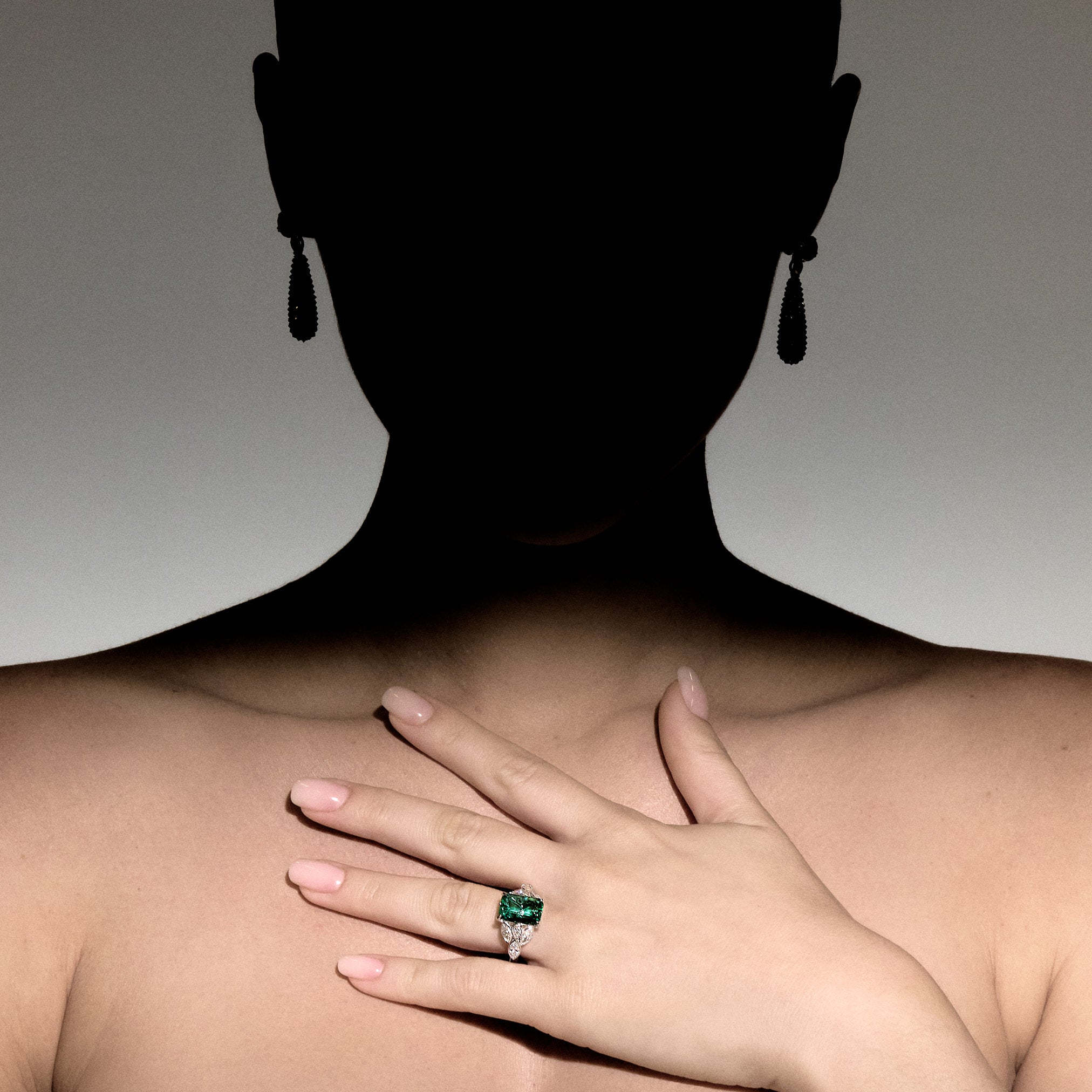 The Emerald Twilight ring from the BrownHaus Vault collection is a striking fusion of nature’s finest treasures. The gem’s luscious green and mirror-like clarity evoke a sense of depth and mystery, which amplifies, by contrast, the purity of the perfectly mastered platinum, six precision-cut marquise and two pear-shaped F VS natural diamonds encased in a gently curved bezel. The scalloped border alongside the marquise and pear diamonds draws us to the surprise detailing of the v-shaped Emerald Twilight basket, which includes 14 round black diamonds set in black rhodium.