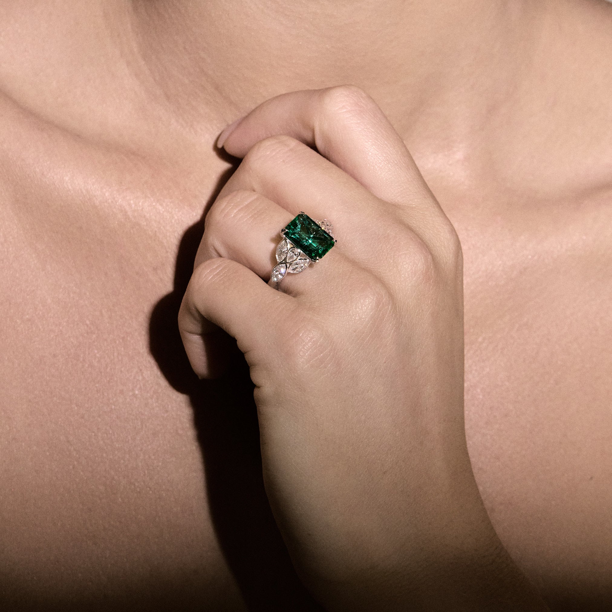 The juxtaposition of the geometric Emerald and sumptuous curves of the marquise and pear diamonds are the night and day of the intricate and refined Emerald Twilight.