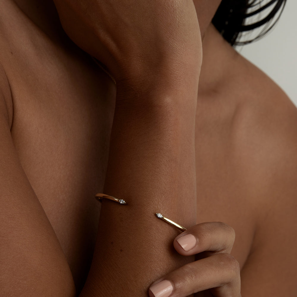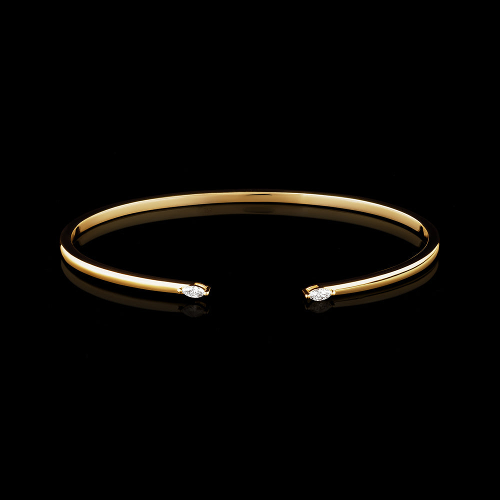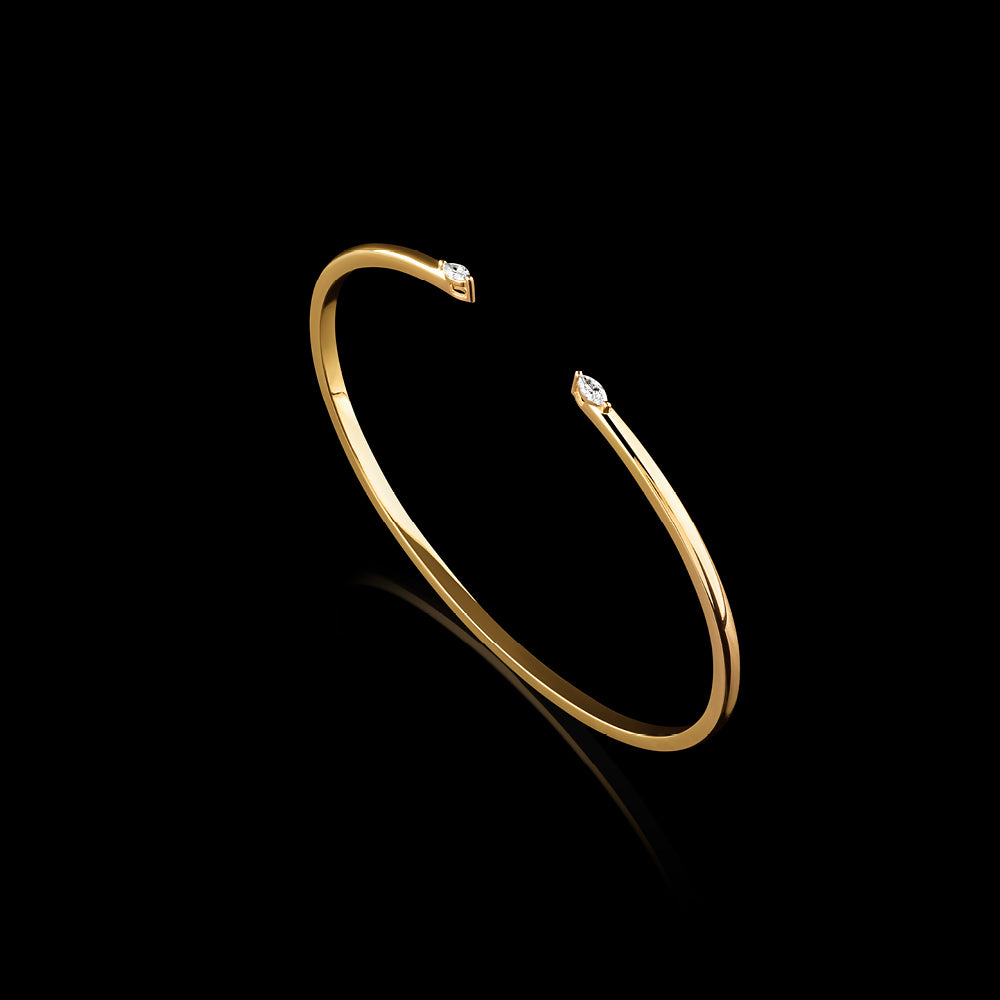 The Simile Open Cuff is crafted from 9K Yellow Gold. The design features two claw-set marques diamonds (4x2mm size). Complete your Folium collection by wearing the Simile Folium cuff with Gemina Folium ring.