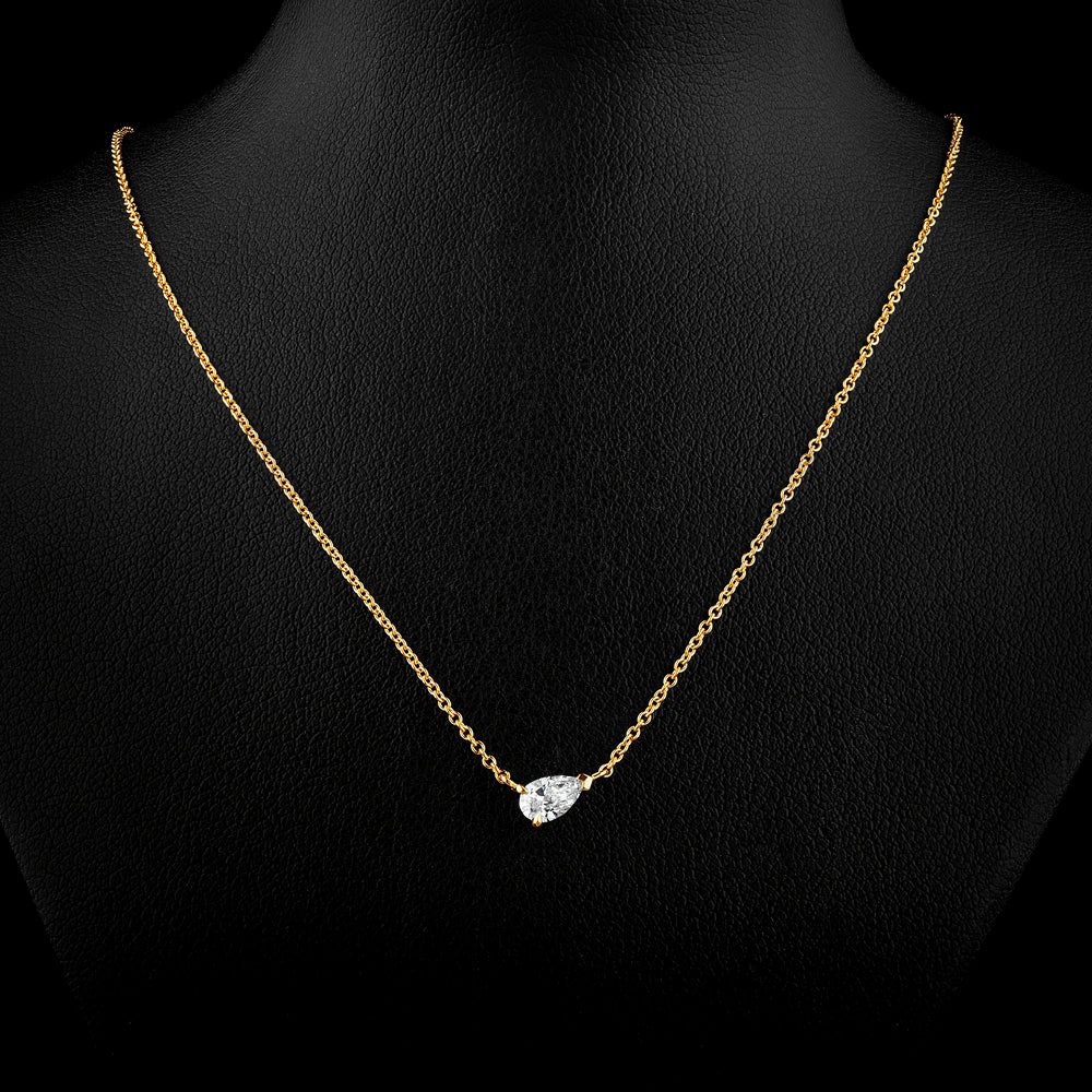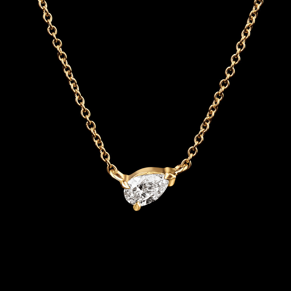The Bellus Pear Necklace is crafted in 9K Gold (Yellow, Rose or White). The design features a 0.20pt pear-shaped diamond, set on a 9K Gold, 45mm chain. Pair this timeless piece with our classic Milium Pear Earrings.