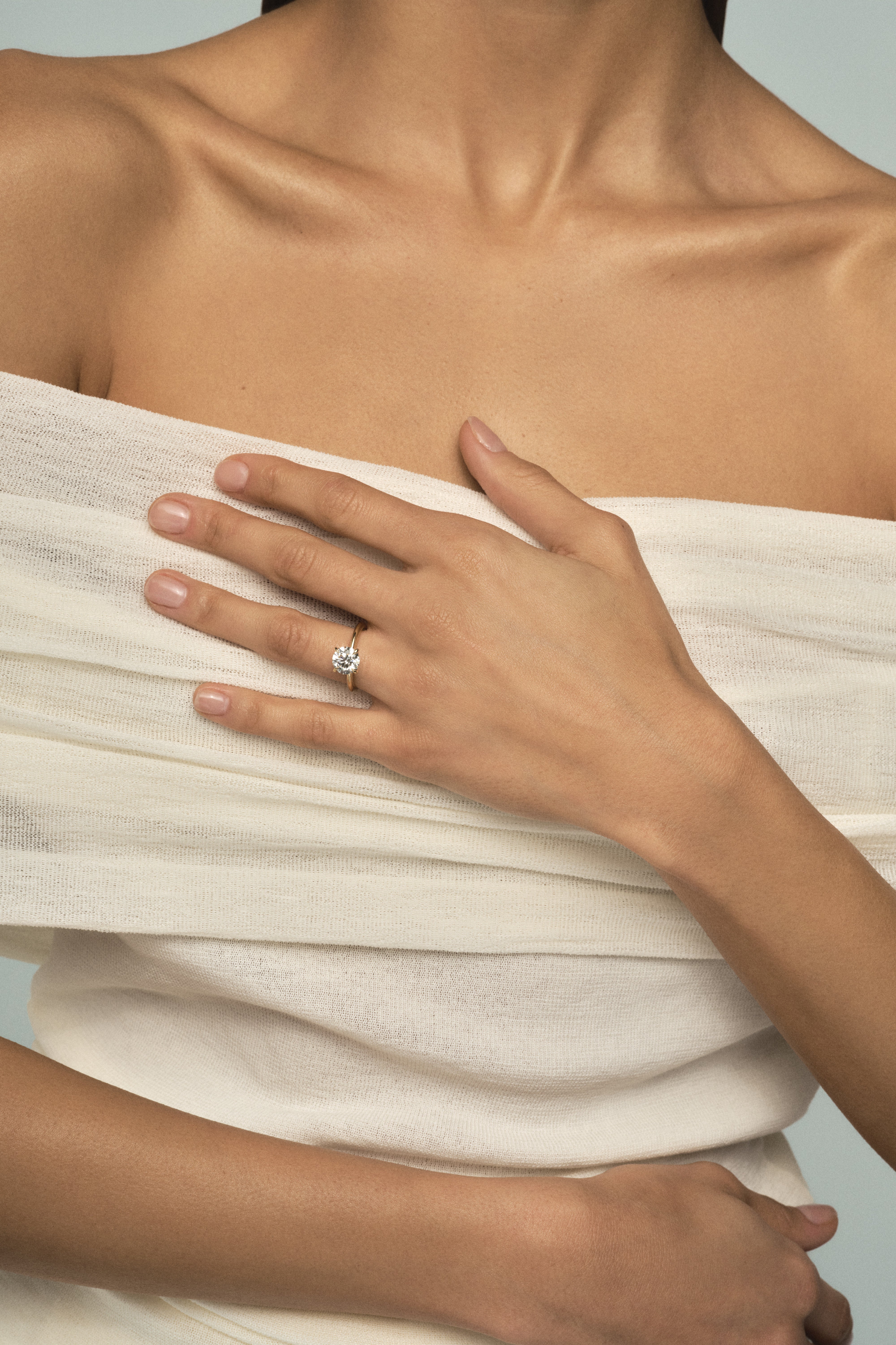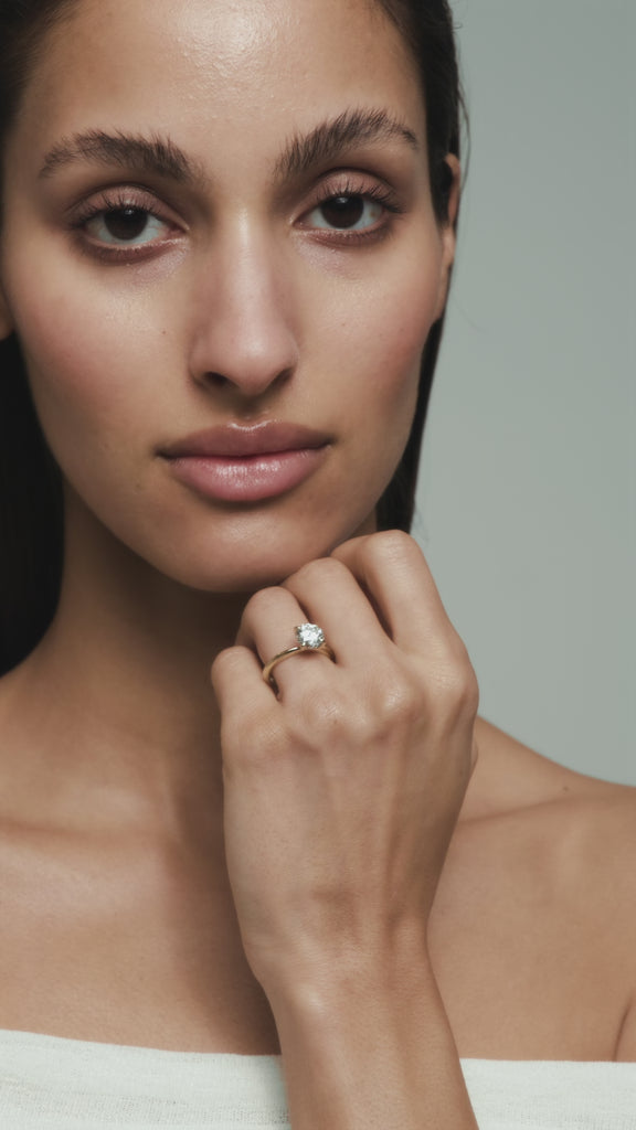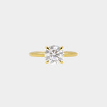 The Bella Round Solitaire, as pictured, is crafted from 18ct Yellow Gold and features a 2.01ct round brilliant lab-grown diamond, graded E VS1. Beneath the center stone lies a delicate hidden halo of 12 gems, adding subtle sparkle to the design. With a total weight of 4.51 grams, this ring offers a refined balance of elegance and brilliance.